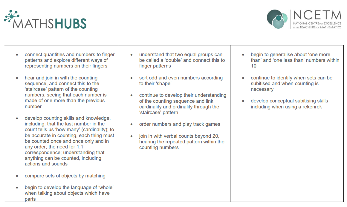 By the end of Reception, most children can count confidently, subitise to 5 and recall number bonds to 5 and some to 10. They also begin to recognise patterns such as odds and evens and understand simple addition and subtraction.